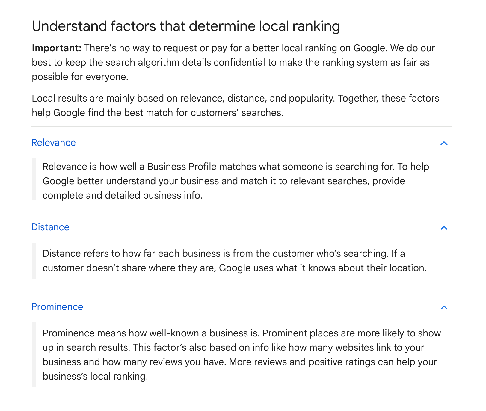 我觉得最有意思的是,谷歌将这句话给删除了:“Your position in web results is also a factor, so search engine optimization (SEO) best practices apply.”。也就是说,有可能,网站在谷歌自然排名中的表现有可能不再作为本地排名的参考因素。